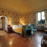 The Palazzo sits on the summit of a hill facing south and east and is shaped like an inverted “T”. A majestic gallery on each of the three floors divides it down the middle, with portals at both ends on the ground floor and a vast grotto with 15th-century arches on the subterranean level. Together with the adjoining chapel, the elevated bell tower and its clock situated in front of the Palazzo offers a gratifying sight to visitors, whether viewed from near or far, and the latter is also connected to the main Villa by an underground passageway. The overall setting is one of delightful rolling hills that are abundant in fruit-bearing oak trees, vineyards and olive groves. In one corner to the east of the Palazzo, one can admire a leafy green area with a small Roccolo featuring antechambers where a group of people can comfortably rest while hunting”.
