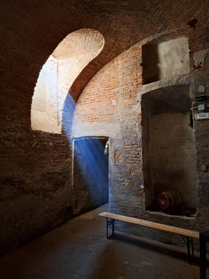 The palazzo features two expansive courtyards with a central garden enclosed by an ornate wrought-iron gate at the centre. The first courtyard, adorned with a portico supported by stone columns, provides access to the main staircase leading to the ‘piano nobile’ floor and the ‘Sala del Vescovo’ or Bishop’s Hall, now used as a modern meeting room. The second courtyard is distinguished by two centuries-old olive trees. Adjacent to these are two entrances leading to the cellars below, which have a maze of corridors and ancient wine vats. In the background, the former stables now house the guest quarters, featuring a well dating back to 1600 and brick vaulted ceilings, creating a uniquely atmospheric setting.